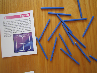 Ho deciso di prendere questa versione sia perché è l'unica in italiano che ho trovato su Vinted ma soprattutto perché ci sono differenti tipi di indovinelli: quelli con un testo più corto che non prevedono un ragionamento troppo intrigato e soprattutto quelli che si risolvono utilizzando dei bastoncini e il tangram, in questo modo, credo che un più ampio range di giocatori possa accostarsi al gioco.